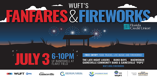 Keep up with the action on social media using the hashtag #Fanfares24. Enjoy an evening of live music and spectacular fireworks presented by WUFT-TV, WUFT-FM and WUFT Classic.